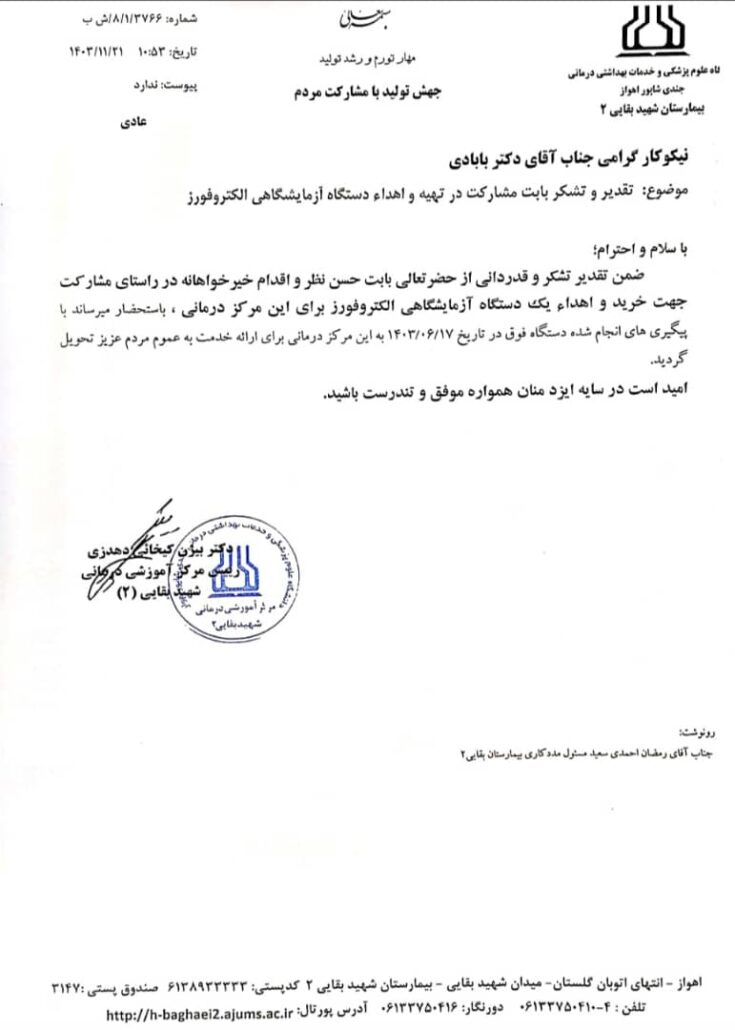 یک دستگاه به ارزش یک میلیارد و چهارصد میلیون تومان به بیمارستان بقائی اهدا شد